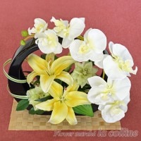 すかしユリのアーティフィシャルフラワーです。ユリの中では小さめのお花です。花びらがしっかりしており、とてもリアルなお花です。当店では「コチョウランとユリの和モダンアレンジ(ホワイト)」で「イエロー」を使用しています。